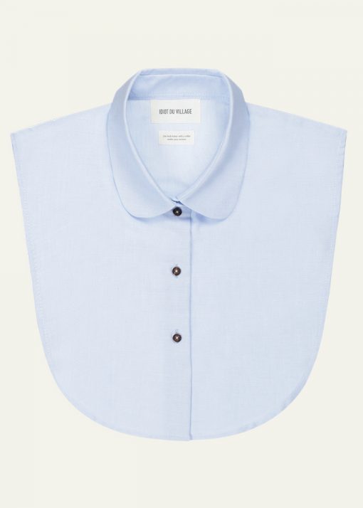 This bold curved bib collar is designed to be layered with your favorite sweaters and knitwear. Made of 100% blue Oxford cotton with horn contrast buttons.